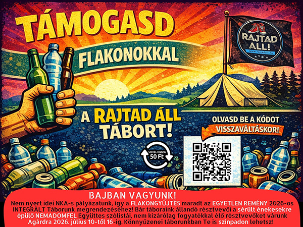 Nem nyert idei NKA-s pályázatunk, így a FLAKONGYŰJTÉS maradt az EGYETLEN REMÉNY 2026-os INTEGRÁLT Táborunk megrendezéséhez! Bár táboraink állandó résztvevői a sérült énekesekre épülő NEMADOMFEL Együttes szólistái, nem kizárólag fogyatékkal élő résztvevőket várunk Agárdra 2026. július 10-től 16-ig. Könnyűzenei táborunkban Te is színpadon lehetsz!